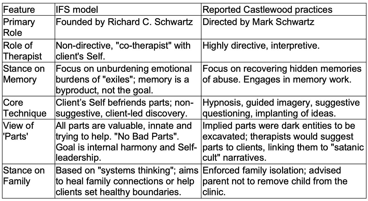 The following table summarizes the fundamental, irreconcilable differences between the IFS model and the practices of Mark Schwartz’s clinic, which The Cut article conflates.